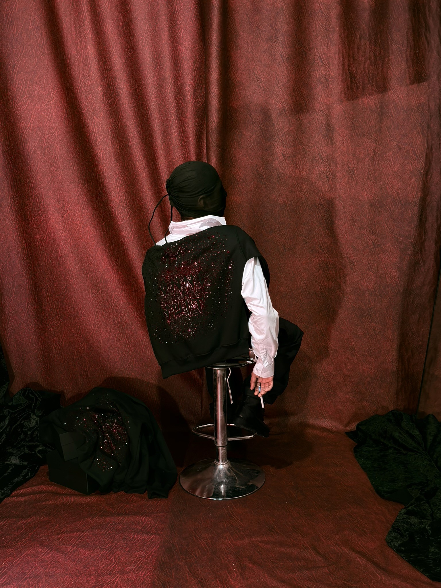 Oversize boxy fit hoodie con piedras color LUĀN crystal yuxtaponiéndose con detalle artesanal. Algodón peinado 450 GSM. Edición limitada.