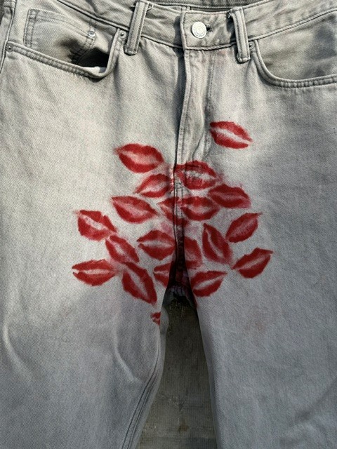 Jeans de mezclilla grises corte holgado con detalle artesanal de pintura de besos de labios. Hecho en México.